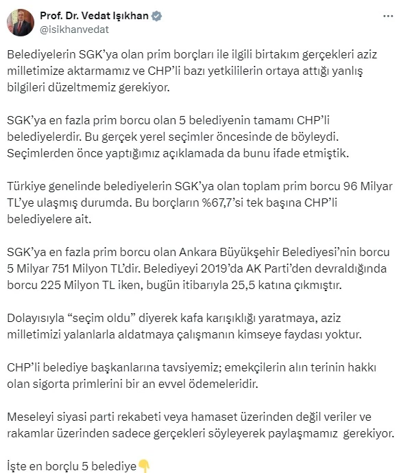 Bakan Işıkhan "SGK'ya en fazla prim borcu olan 5 belediyenin tamamı CHP'li belediyelerdir. Bu gerçek yerel seçimler öncesinde de böyleydi. Seçimlerden önce yaptığımız açıklamada da bunu ifade etmiştik.