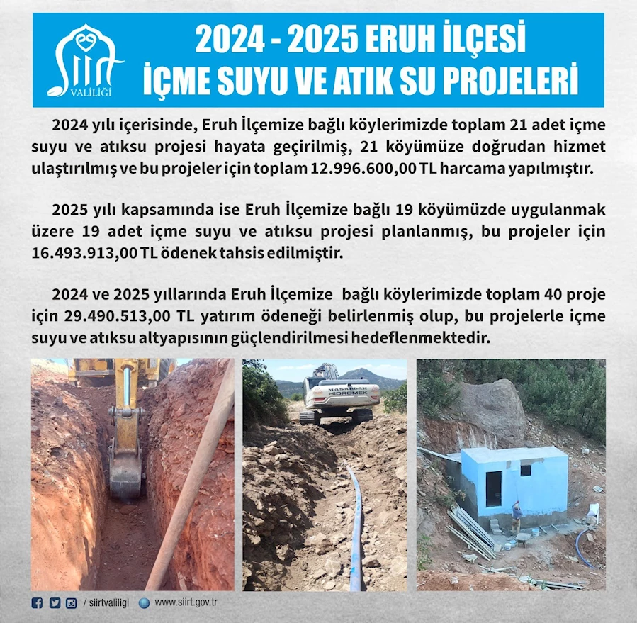 Siirt Valiliği, 2024 ve 2025 yıllarında Eruh ilçesine bağlı 40 köyde içme suyu ve atıksu projeleri için toplamda 29 milyon 490 bin TL yatırım ödeneği ayırdı. 2024'te 21 köyde proje tamamlanırken, 2025 için 19 köyde yeni projeler planlandı.