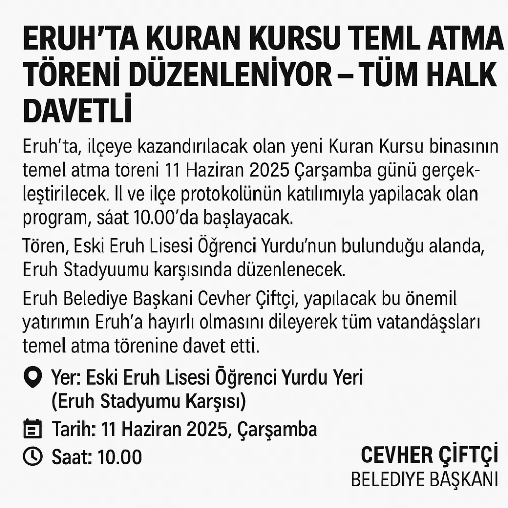 Eruh’ta, ilçeye kazandırılacak olan yeni Kuran Kursu binasının temel atma töreni 11 Haziran 2025 Çarşamba günü gerçekleştirilecek. İl ve ilçe protokolünün katılımıyla yapılacak olan program, saat 10.00’da başlayacak.