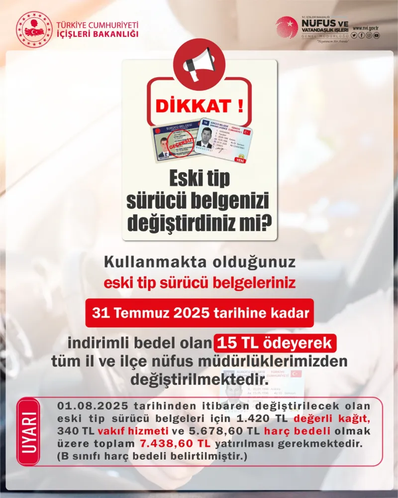 Ancak bu süreyi kaçıranlar için ciddi bir mali yük söz konusu olacak. 1 Ağustos 2025 tarihinden itibaren yapılacak değişimlerde; 1.420 TL değerli kâğıt bedeli, 340 TL vakıf hizmet bedeli, 5.678,60 TL harç bedeli olmak üzere toplam 7.438,60 TL ödeme yapılması gerekecek. (Bu tutar B sınıfı ehliyet için geçerlidir.)