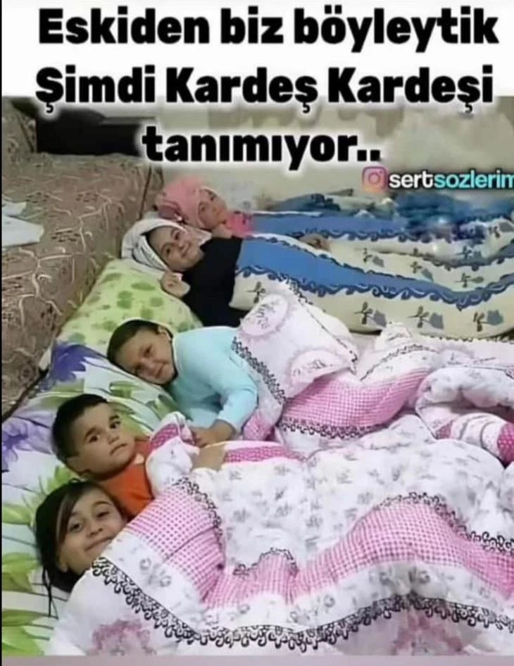 Sosyal medyada paylaşılan ve kısa sürede büyük ilgi gören bir fotoğraf, geçmişten bugüne kardeşlik ilişkilerinin nasıl değiştiğini gözler önüne serdi. Görselde, bir evin salonunda yere serilmiş yataklarda yan yana yatan kardeşler görülüyor. Üstlerinde rengârenk yorganlar, yüzlerinde gülümseme ve huzur var. Fotoğrafın üstüne yazılan “Eskiden biz böyleydik, şimdi kardeş kardeşi tanımıyor” cümlesi, toplumsal hafızada derin bir karşılık buldu.