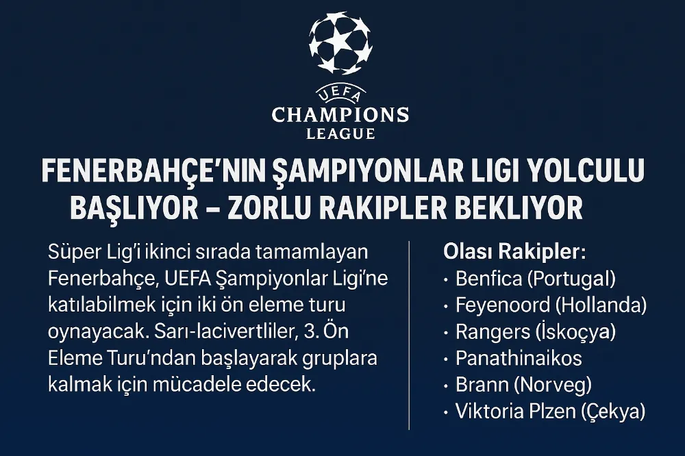 Sezonu Süper Lig'de ikinci sırada tamamlayan Fenerbahçe, UEFA Şampiyonlar Ligi'ne katılmak için iki ön eleme turu oynayacak. Sarı-lacivertli ekip, 3. Ön Eleme Turu'ndan başlayacak ve bu turda seri başı olup olmayacağı henüz netlik kazanmadı. Fenerbahçe'nin olası rakipleri arasında Benfica, Feyenoord, Rangers, Panathinaikos, Brann, Viktoria Plzen ve Young Boys gibi güçlü takımlar bulunuyor. Bu turu geçmesi halinde, Play-Off Turu'na kalacak olan Fenerbahçe, bu aşamayı da geçerse Şampiyonlar Ligi gruplarına katılma hakkı elde edecek.