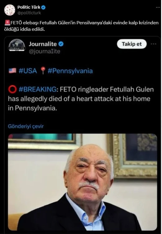 Geçen aylarda da benzer iddialarla gündeme gelen FETÖ elebaşı Fetullah Gülen'in öldüğü yönünde iddialar bir kez daha söz konusu oldu. Sosyal medya üzerinden Fethullah Gülen’in kalp krizi geçirerek öldüğüne yönelik haberler dolaşıma sokuldu. Henüz resmi bir açıklama yapılmadı.