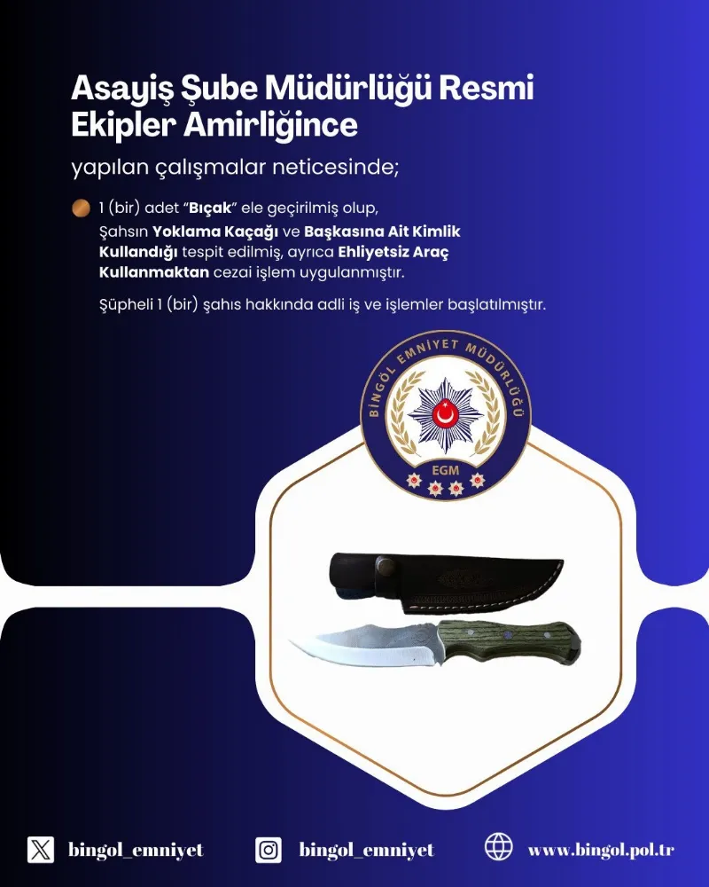 Bingöl'de yakalama kaçağı olan şahıs, başkasına ait kimliği taşırken yakalandı. Bingöl Emniyet Müdürlüğü Asayiş Şube Müdürlüğü ekiplerince uygulama gerçekleştirildi. Uygulamada yapılan aramalarda, yakalama kaçağı olarak aranan şahıs, üzerinde bıçakla, başkasına ait kimlikle, ehliyetsiz araç kullanırken yakalandı. Şahıs hakkında adli ve idari işlemlere başlandığı belirtildi.