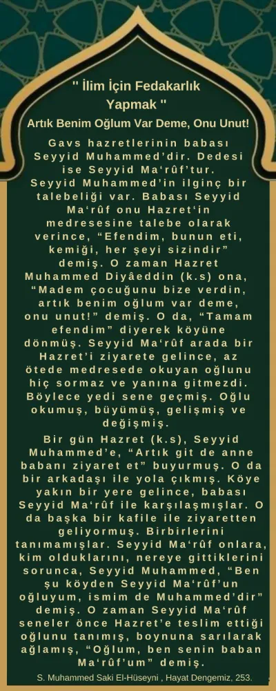 Tasavvuf tarihine geçen bir hassasiyetle, kendisine halifelik tevcih edilmek istendiğinde, “Siz hayattayken ben halifelik yapamam” diyerek edebini muhafaza etmiş; “Eğer benden önce vefat ederseniz halka açıklarsınız; ben önce vefat edersem mezarım başında açıklarsınız” sözleriyle istikametini beyan etmiştir. Nitekim Seyyid Muhammed el-Hüseynî Hazretleri daha önce vefat etmiş; Muhammed Diyâüddin Norşinî Hazretleri de, “Bu memlekette Seyyid Muhammed gibisini görmedim” diyerek onun mânevî mertebesini bizzat ilan etmiştir.