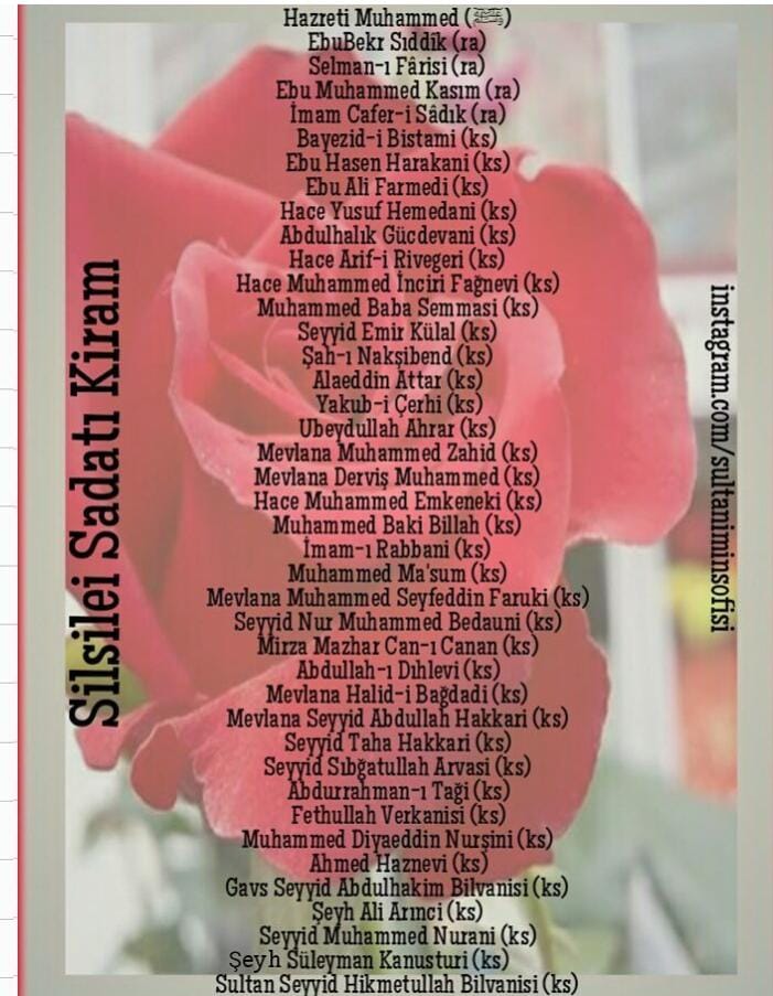 Paylaşılan görsellerde yer alan ve Nakşibendî yolun omurgasını oluşturan Altın Silsile, Seyyid Hikmetullah Efendi’nin temsil ettiği irfan çizgisini açıkça göstermektedir: