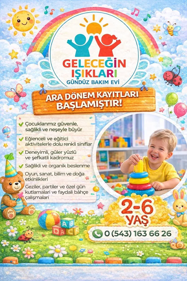 Çocukların güvenli, sağlıklı ve nitelikli bir ortamda büyümesini esas alan Geleceğin Işıkları Gündüz Bakım Evi, ara dönem kayıtlarını başlattığını duyurdu. 2–6 yaş aralığındaki çocuklara yönelik hizmet veren bakım evi, hem eğitim hem de bakım alanında sunduğu kapsamlı imkânlarla ailelerin dikkatini çekiyor.