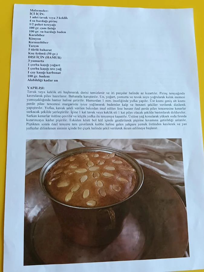 Hamurun yumurtayla açılması için bir kat pilav konması bir kat keklik eti tekrar bir kat pilav tekrar keklik eti şeklinde ve en son olarak hamuru üst kısımda kapatılarak pişirilmeye verilmesi gelir