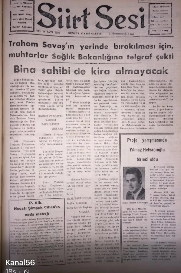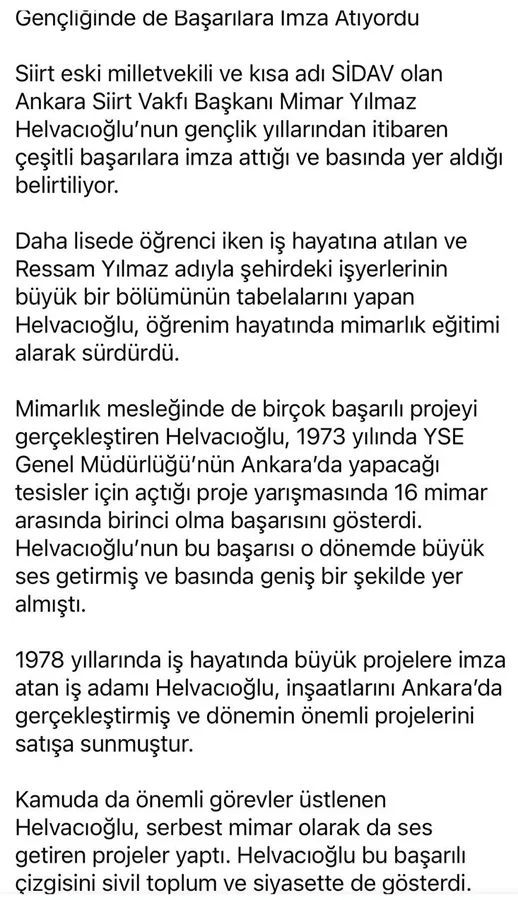 Siirt’in yetiştirdiği önemli isimlerden biri olan, aynı zamanda Ankara Siirt Vakfı (SİDAV) Başkanı ve eski milletvekili Mimar Yılmaz Helvacıoğlu, gençlik yıllarından itibaren başarılarıyla dikkat çeken bir isim oldu. Helvacıoğlu’nun 1970’li yıllarda yerel basında yer alan haberleri, bugün de ilham verici bir yaşam öyküsüne ışık tutuyor.