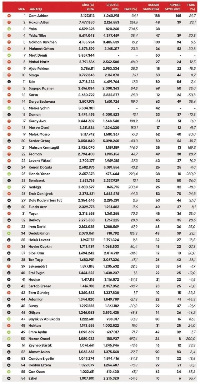 2024 yılının sahne gelirleri listesine göre zirvede 8.127.513 Euro ile Cem Adrian yer aldı. Adrian, 188 konser vererek hem en çok sahneye çıkan hem de en çok kazanan sanatçı oldu. Ancak bu yıl listenin esas sürprizi, ikinci sıradaki Hakan Altun'dan geldi.