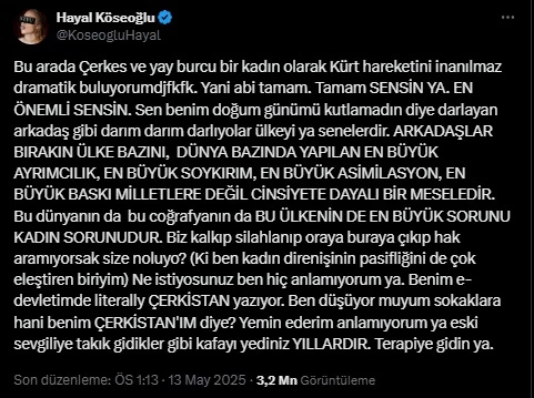 “Çerkes ve yay burcu bir kadın olarak Kürt hareketini inanılmaz dramatik buluyorum. Yani abi tamam, tamam sensin ya. En önemli sensin. Sen benim doğum günümü kutlamadın diye darlayan arkadaş gibi darım darım darlıyorlar ülkeyi senelerdir. Arkadaşlar bırakın ülke bazını, dünya bazında yapılan en büyük ayrımcılık, soykırım, asimilasyon, baskı milletlere değil cinsiyete dayalıdır. Bu dünyanın, bu coğrafyanın ve bu ülkenin en büyük sorunu kadın sorunudur. Biz kalkıp silahlanıp hak aramıyorsak size ne oluyor? Benim e-Devlet'te gerçekten Çerkistan yazıyor. Düşüyor muyum sokaklara 'hani benim Çerkistan'ım' diye? Yemin ederim anlamıyorum, eski sevgiliye takık gidikler gibi yıllardır kafayı yediniz. Terapiye gidin ya!”