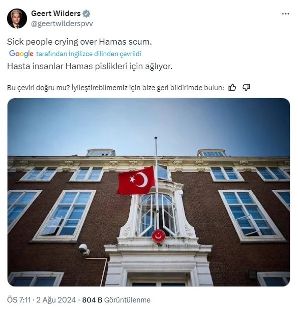 Son dönemlerde Cumhurbaşkanı Erdoğan ve Türkiye aleyhinde yaptığı skandal paylaşımlarla adından söz ettiren Hollandalı siyasetçi Geert Wilders, Türk bayrağının yarıya indirildiği fotoğrafı paylaşıp Türkiye'ye hakaret etti. Wilders paylaşımında, "Hamas pisliği için ağlayan hasta insanlar." ifadesini kullandı.