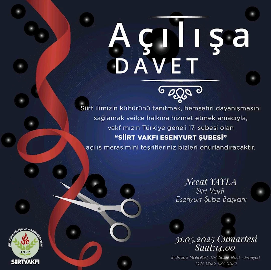 Ülkemizin kırk ilinde faaliyet gösteren Siirt dernek ve vakıflarına bir yenisi daha ekleniyor. Siirtlilerin birlikteliğini güçlendirmek ve kültürel değerleri yaşatmak amacıyla kurulan Siirt Vakfı Esenyurt Şubesi, düzenlenecek törenle resmen açılıyor.
