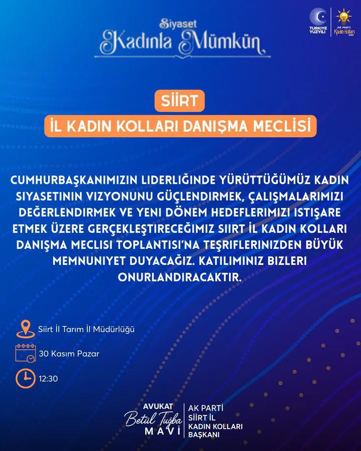 Yeni dönem hedeflerinin belirlenmesi ve gelişen kadın politikalarının daha da güçlendirilmesi amacıyla, teşkilat mensuplarına yönelik özel bir toplantı düzenlenecek. Toplantıda, kadın siyasetinin rolü, mevcut çalışmaların değerlendirilmesi ve geleceğe yönelik stratejiler üzerine kapsamlı bir değerlendirme yapılacak. Kadınların siyasetteki etkinliğini artırmaya yönelik adımlar masaya yatırılacak. Teşkilat mensupları, bu süreçteki katkılarını paylaşacak ve daha güçlü yarınlara yürümek için ortak bir yol haritası belirleyecek.