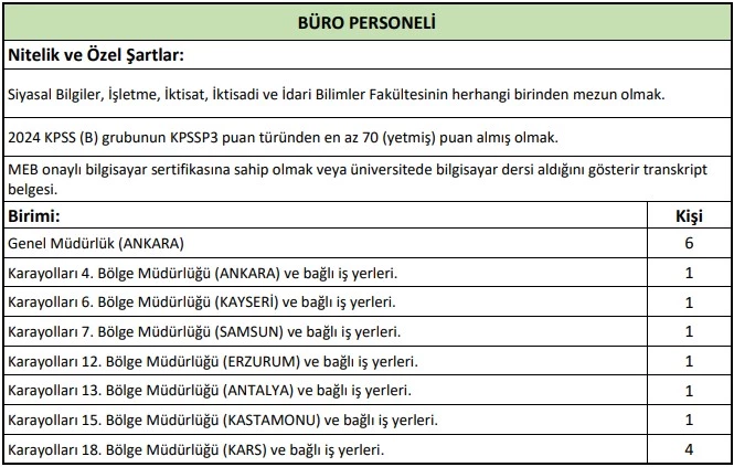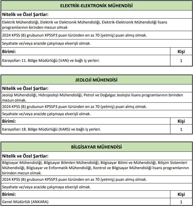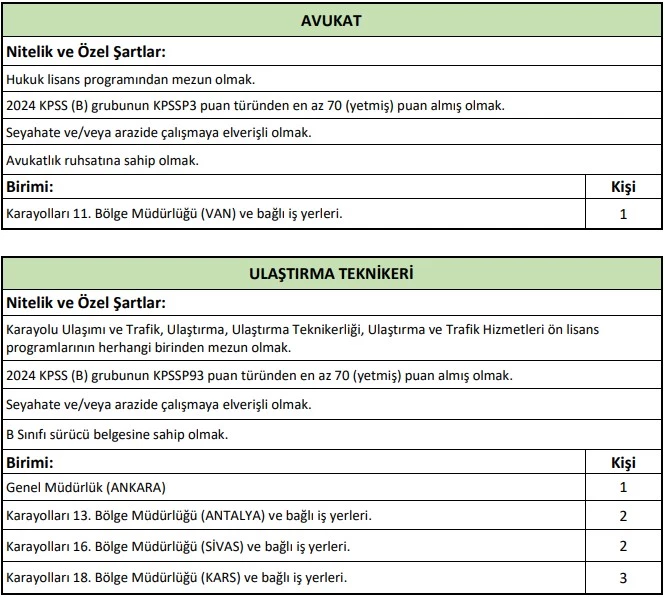 Karayolları Genel Müdürlüğü, 657 sayılı Devlet Memurları Kanunu'nun 4/B maddesi uyarınca, 06/06/1978 tarihli ve 7/15754 sayılı Bakanlar Kurulu Kararı ile yürürlüğe konulan "Sözleşmeli Personel Çalıştırılmasına İlişkin Esaslar"ın Ek Madde 2'ye göre, merkez ve taşra teşkilatındaki birimlerde görevlendirilmek üzere toplam 41 sözleşmeli personel alacağını duyurdu.