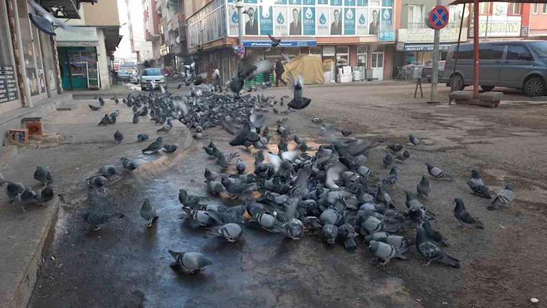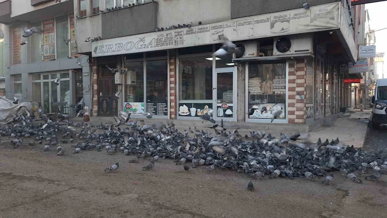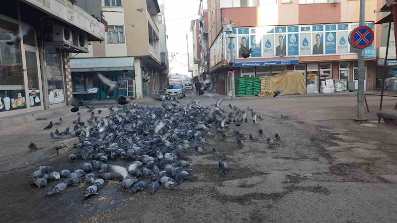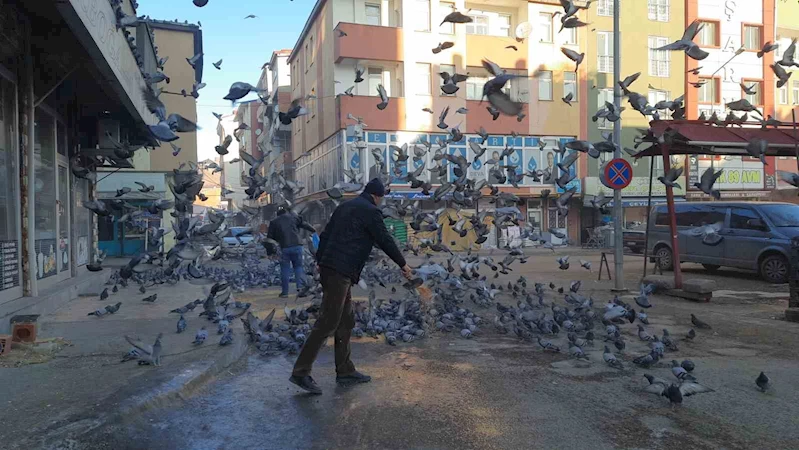 Kars’ta duyarlı vatandaş yüzlerce güvercine yem veriyor