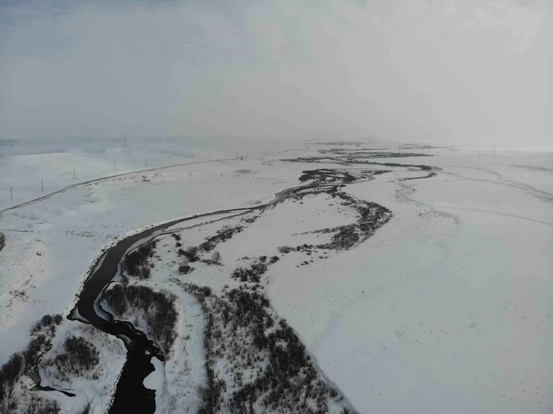 Kars’ta karla kaplanan doğa havadan görüntülendi. Beyaz örtüyle kaplanan menderesler ve köyler, kartpostallık manzaralar oluşturdu.