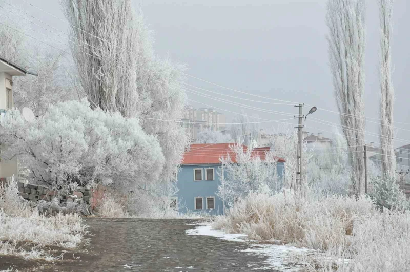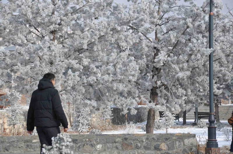 Kars’ta soğuk havada ağaç dallarında oluşan kırağı, ortaya kartpostallık görüntüler çıkardı.