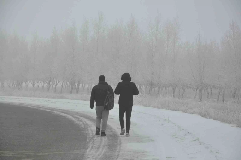 Hava sıcaklıklarının sıfırın altında 18 dereceye düşmesiyle birlikte oluşan kırağı, ağaçları beyaza bürüdü. Vatandaşlar ise sis ve kırağı tutan ağaçların arasında yürüdü.