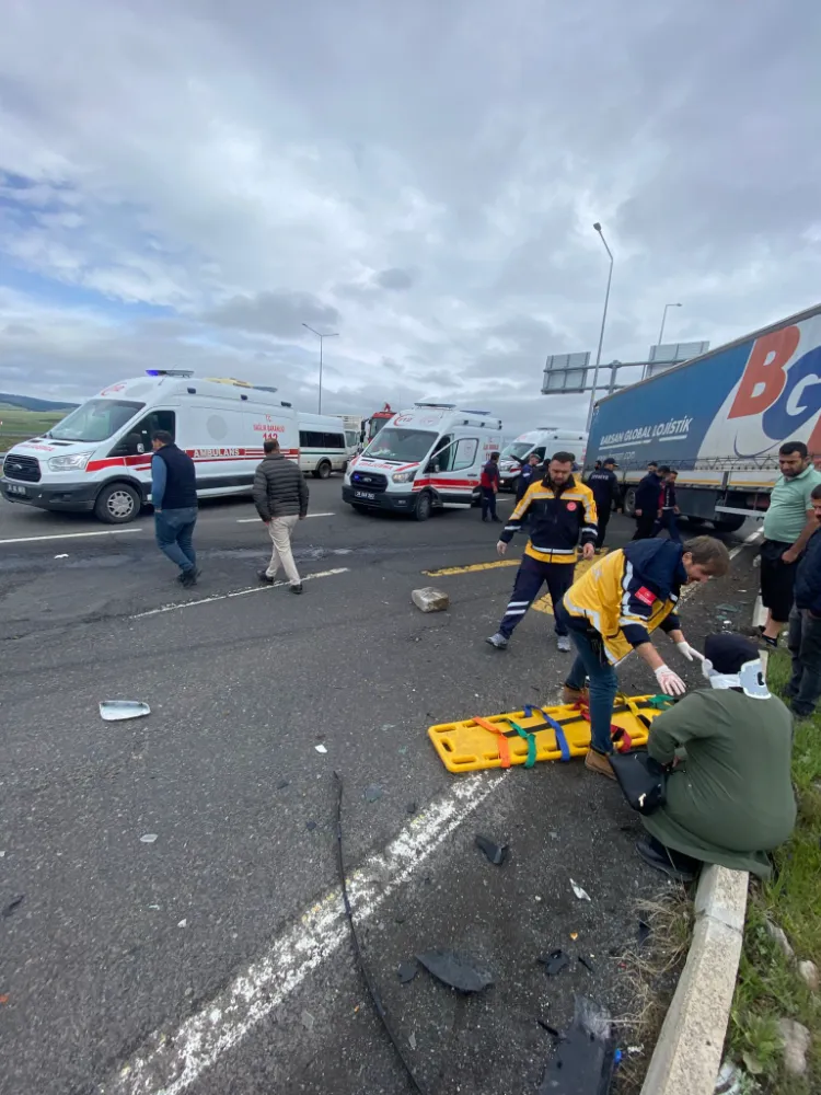 Öte yandan tır ile otomobilin çarpıştığı bölge adeta savaş alanına döndü. Tır ile çarpışan otomobil hurda haline gelirken, trafik levhaları ise yan yattı. Araçların parçaları ise etrafa savruldu. Kaza ile ilgili tahkikat başlatıldı.