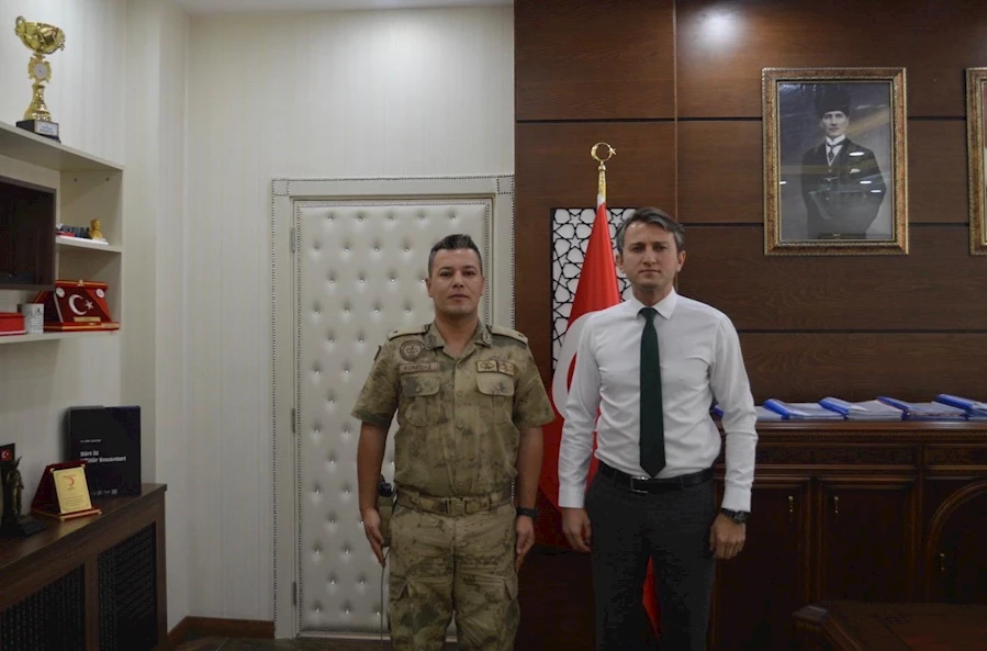 Baykan ilçesinde Çukurca Jandarma Karakol Komutanı olarak görev yapan Jandarma Teğmen Mahmut Korkmaz, yeni görev yeri olan Hatay/Antakya Merkez Jandarma Karakoluna atanması dolayısıyla Baykan Kaymakamı Fatih Özcan’a veda ziyaretinde bulundu.