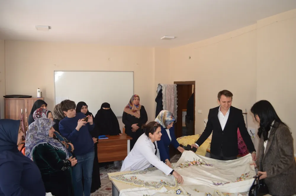 Aile Destek Merkezinde, Kilim, nakış,Tel kırma, Kuaför, dikiş kursu, el sanatları kursu, triko kursu, kuaför kursunu ve diğer geleneksel el sanatları kurslarını ziyaret eden Kaymakam Özcan, kurslara katılan kadınların, mesleki eğitimin ardından ilgili kurumların verdiği hibe ve kredilerle, kendi iş yerini açabilme imkanı bulduğunu ifade etti.
