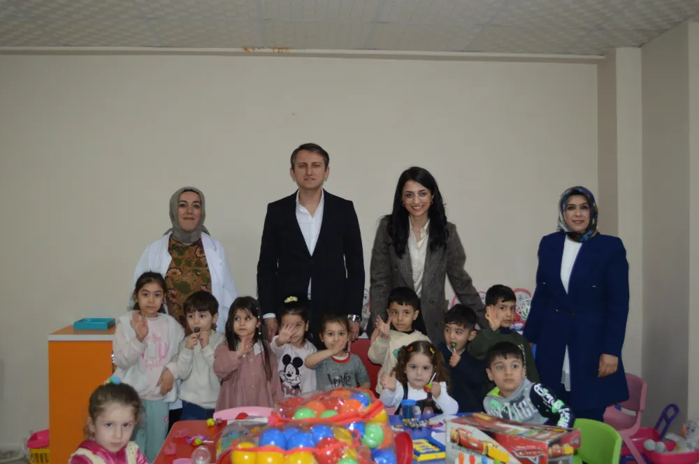 Kreş öğrencilerine de oyuncak, oyun hamurları,topitop, çikolata dağıtımı yaptı.