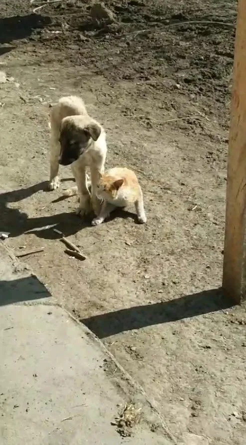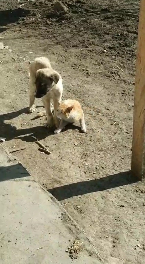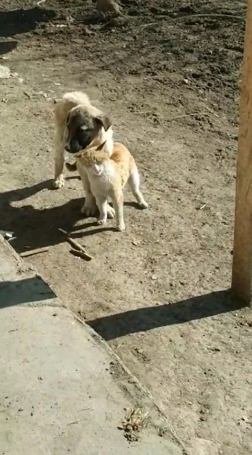 Kars’ın Akyaka ilçesine bağlı Şahnalar köyünde bir vatandaş tarafından kaydedilen görüntülerde, kedinin sevecen tavırlarla köpeğe sokularak ona güvenle yaslandığı ve oyun oynadığı anlar yer alıyor.