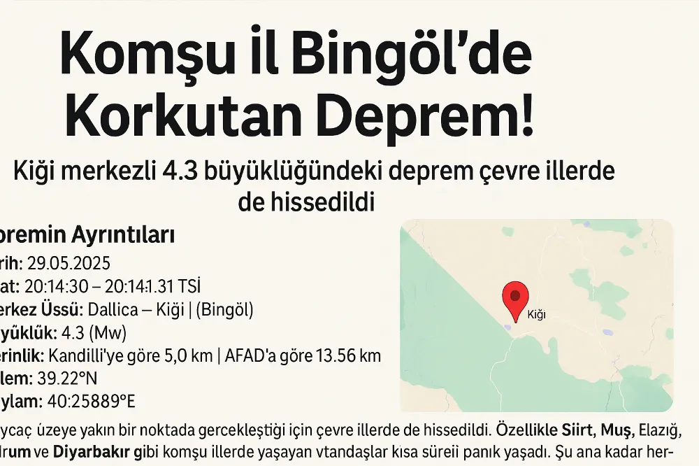 Bingöl’ün Kiğı ilçesi 29 Mayıs 2025 Çarşamba günü saat 20:14 sularında meydana gelen depremle sarsıldı. Kandilli Rasathanesi ve AFAD (Afet ve Acil Durum Yönetimi Başkanlığı) verilerine göre depremin büyüklüğü 4.3 olarak kaydedildi.
