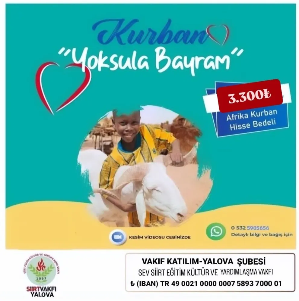 Siirt Eğitim Kültür ve Yardımlaşma Vakfı, (SİİRTVAKFI) yaklaşan Kurban Bayramı öncesinde anlamlı bir kampanyaya daha imza attı. “Kurban, Yoksula Bayram” sloganıyla başlatılan yardım organizasyonu kapsamında, Afrika’daki ihtiyaç sahiplerine kurban etleri ulaştırılıyor.