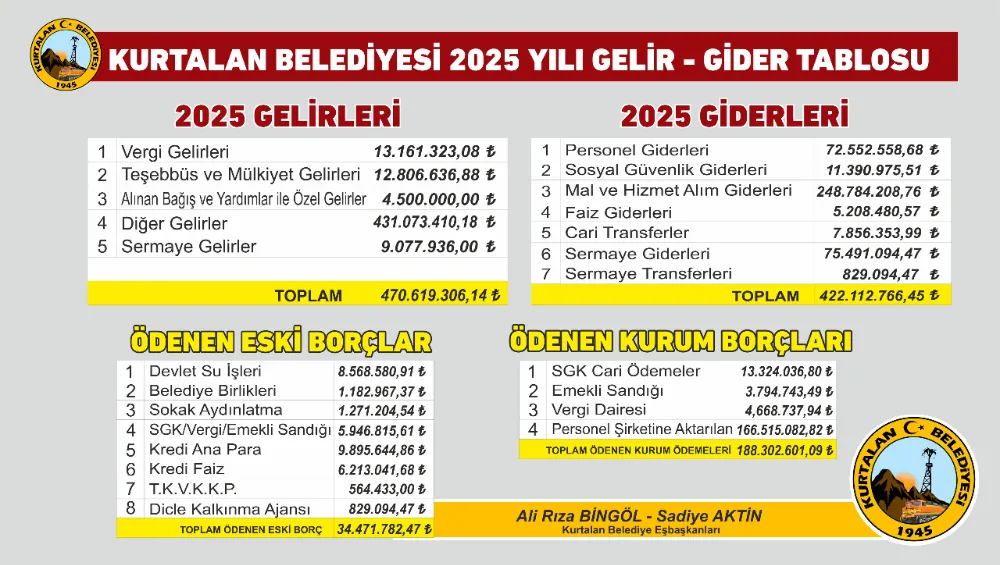 Kurtalan Belediyesi, şeffaflık ve hesap verebilirlik vurgusuyla 2025 Yılı Gelir–Gider Tablosunu kamuoyunun bilgisine sundu.