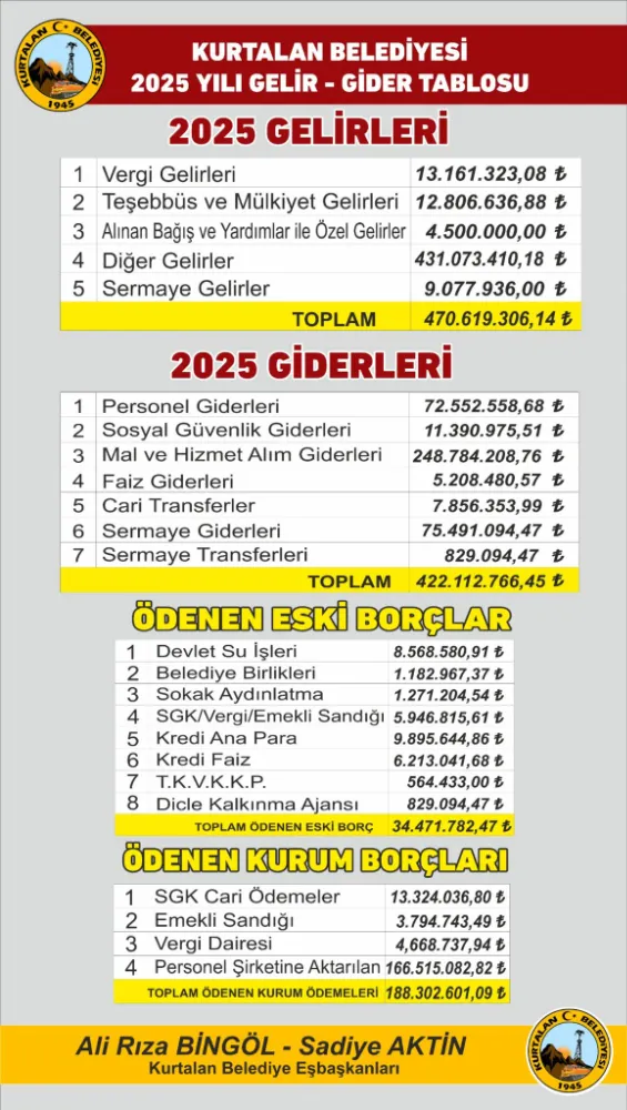 2025 yılına ait gelir–gider tablosu, tüm Kurtalan halkının incelemesine ve denetimine açık hale getirilirken, vatandaşların sürece aktif katılım göstermesi çağrısında bulunuldu.
