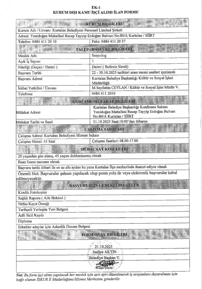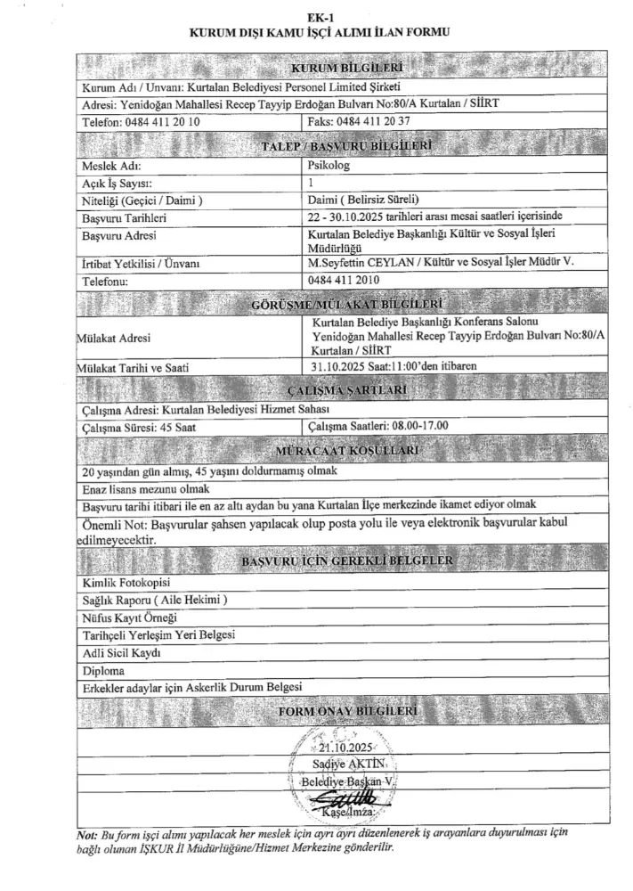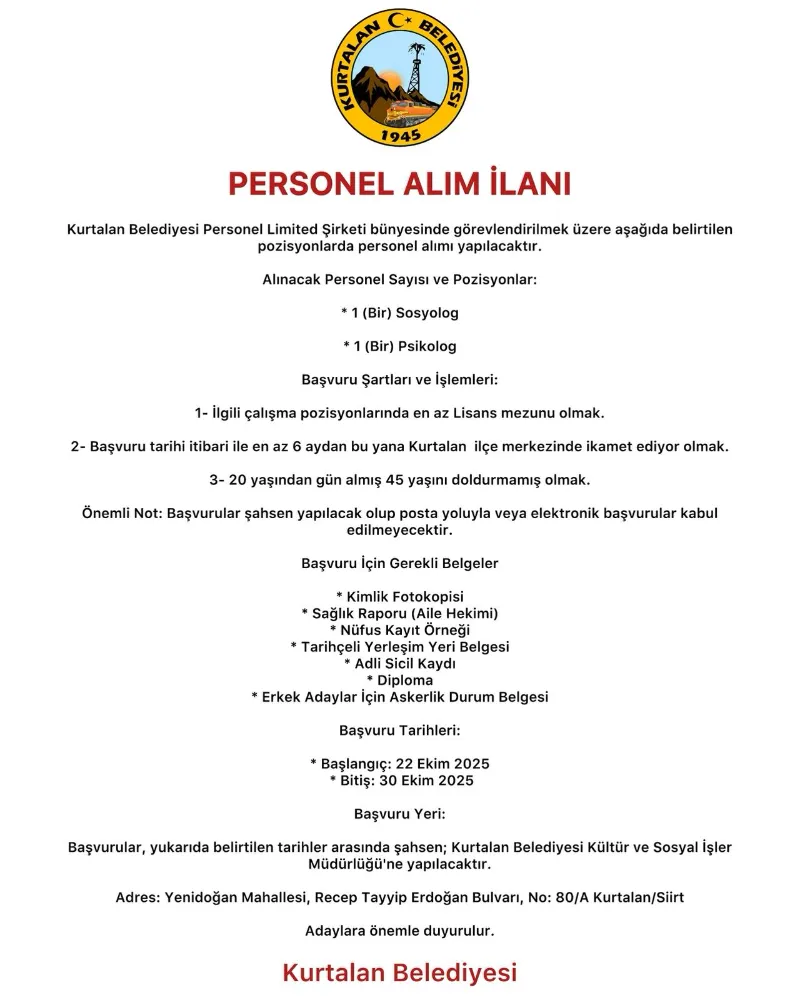 Kurtalan Belediyesi Personel Limited Şirketi, sosyal hizmet alanındaki kapasitesini artırmak ve ilçedeki vatandaşlara daha etkin hizmet sunmak amacıyla sosyolog ve psikolog alımı gerçekleştirecek. Belediye bünyesinde görevlendirilecek personeller, hem sosyal projelerde hem de bireylerin psikolojik destek süreçlerinde görev alacak.