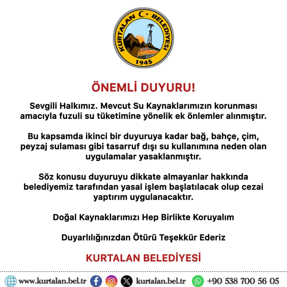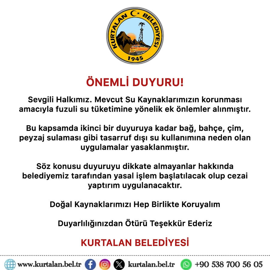 Kurtalan Belediyesi, mevcut su kaynaklarının korunması amacıyla fuzuli su tüketimine karşı ek tedbirler aldığını duyurdu. Belediyeden yapılan açıklamada, ikinci bir duyuruya kadar bağ, bahçe, çim ve peyzaj sulaması gibi tasarruf dışı su kullanımına neden olan uygulamaların yasaklandığı bildirildi.