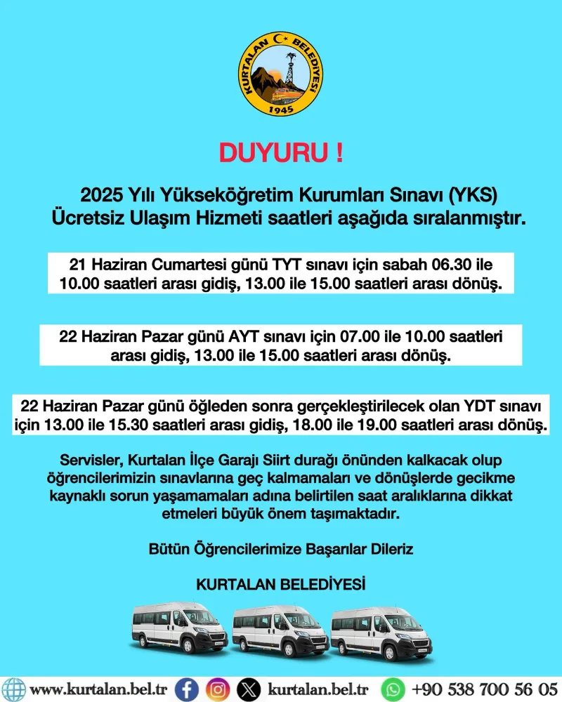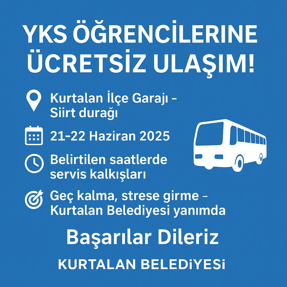 Kurtalan Belediyesi, 2025 Yükseköğretim Kurumları Sınavı (YKS) kapsamında Siirt merkezde sınava girecek öğrencilere yönelik ücretsiz ulaşım hizmeti sağlayacağını duyurdu.