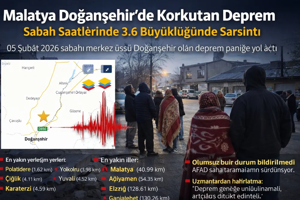 AFAD verilerine göre; 05 Şubat 2026 Perşembe günü saat 06.15.53’te, merkez üssü Doğanşehir (Malatya) olan 3.6 (ML) büyüklüğünde bir deprem kaydedildi.