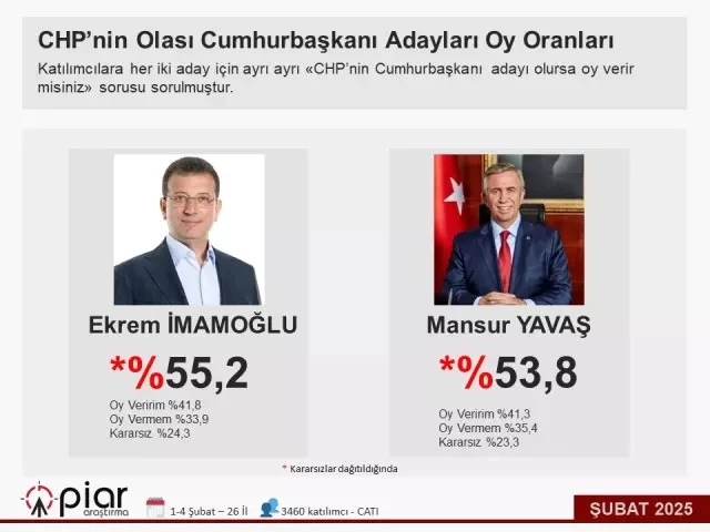 1-4 Şubat tarihlerinde Piar Araştırma tarafından yapılan bir ankette, Mansur Yavaş ve Ekrem İmamoğlu arasında Cumhurbaşkanlığı adaylığı için ciddi bir yarış olduğu ortaya çıktı. Ankete katılanlara, "CHP’nin Cumhurbaşkanı adayı olsa oy verirsiniz?" sorusu yöneltildiğinde, Ekrem İmamoğlu'na oy vereceğini söyleyenlerin oranı yüzde 55.2, Mansur Yavaş’a oy vereceğini belirtenlerin oranı ise yüzde 53.8 oldu. Bu oranlar, Yavaş’ın bağımsız adaylık şansını güçlendiriyor ve Cumhurbaşkanlığı yarışında dengeleri değiştirebilir.