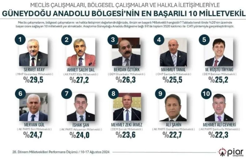 @PiarArastirma araştırma şirketinin yapmış olduğu araştırmalar sonucunda Güney Doğu Anadolu Bölgesi’nin Meclis Çalışmaları, Bölgesel çalışmalar ve halkla iletişimleriyle en iyi olan 10 milletvekili arasına girmiş bulunuyoruz.