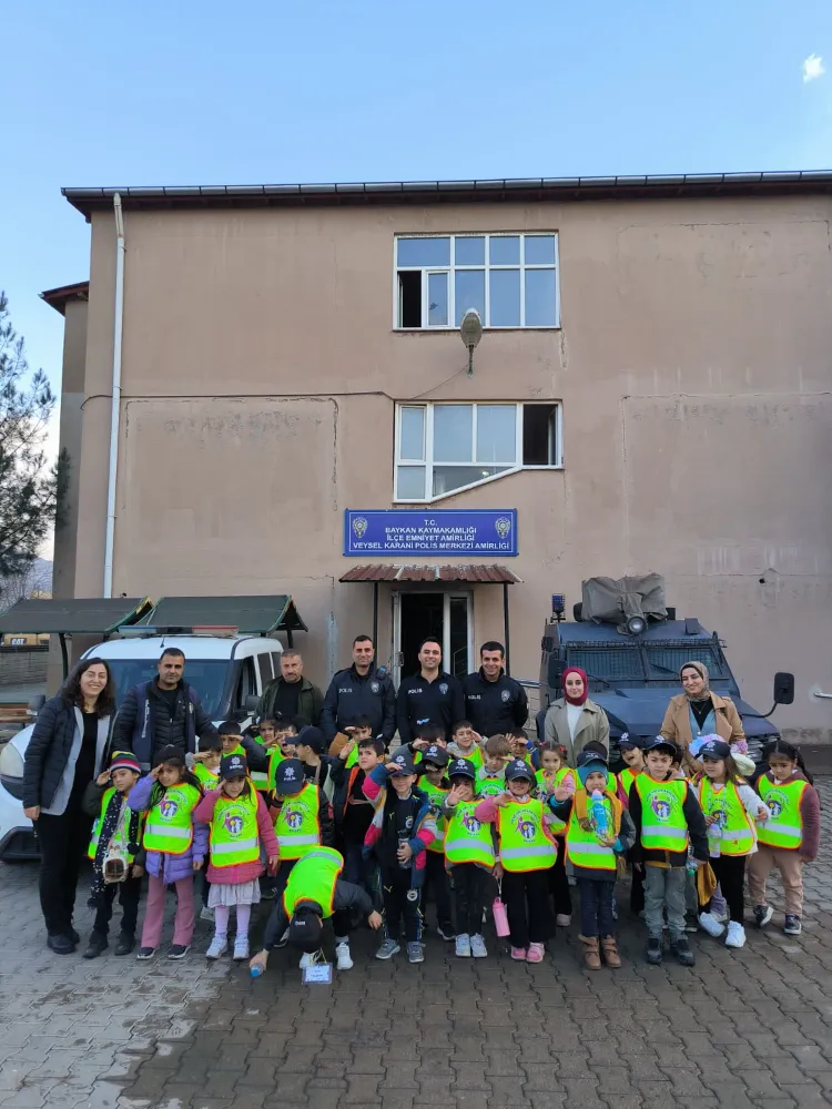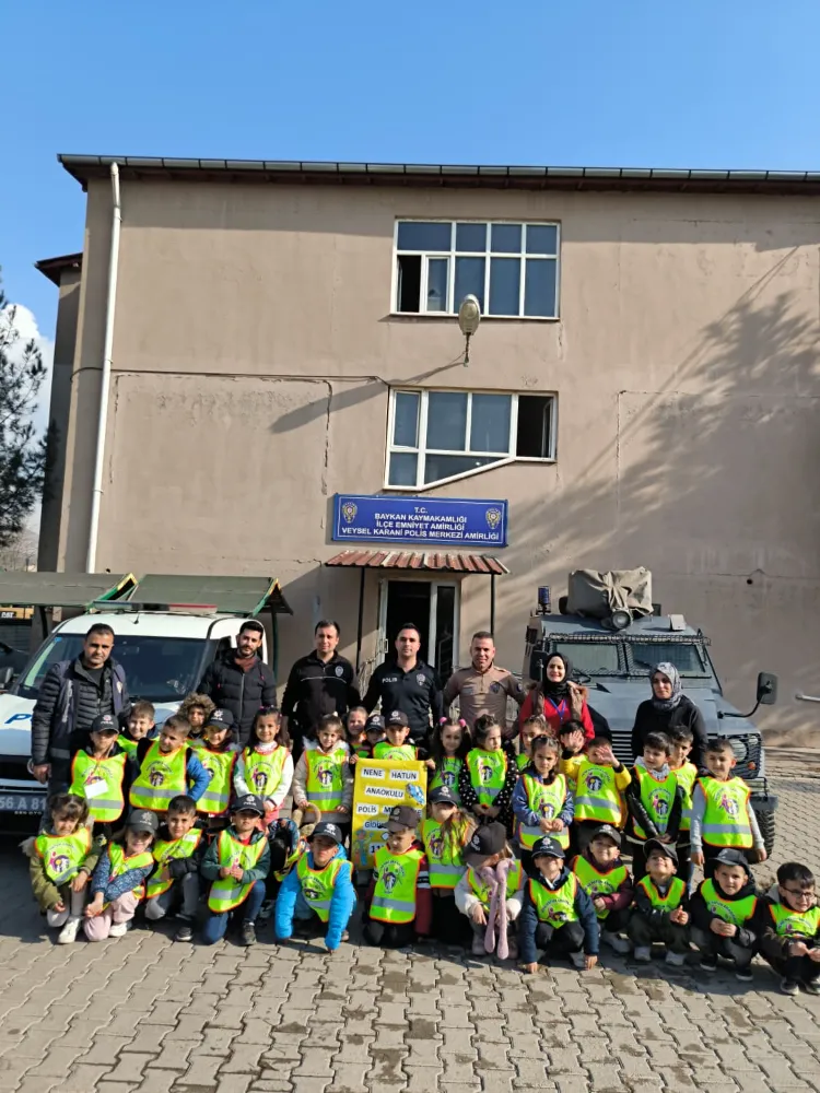 Baykan İlçe Emniyet Amirliği ve Veysel Karani Polis Merkezi, bugün Nene Hatun Anaokulu’nun minik öğrencilerini ağırladı. Kardelenler, Laleler, Güneş Çiçekleri, Orkideler, Menekşeler ve Papatyalar sınıflarından gelen çocuklar, polis merkezine adım attıkları andan itibaren büyük bir heyecan yaşadı.