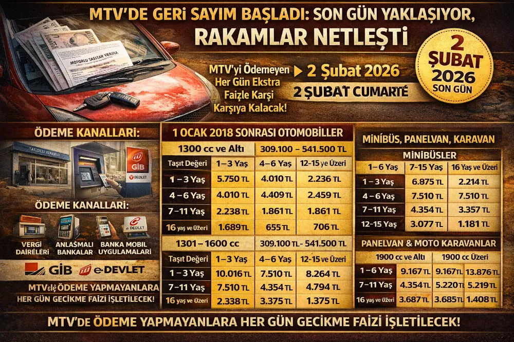 2026 yılı MTV ilk taksit ödemeleri için son gün 2 Şubat 2026. Sürenin aşılması halinde, borç tutarına günlük gecikme faizi uygulanacak.