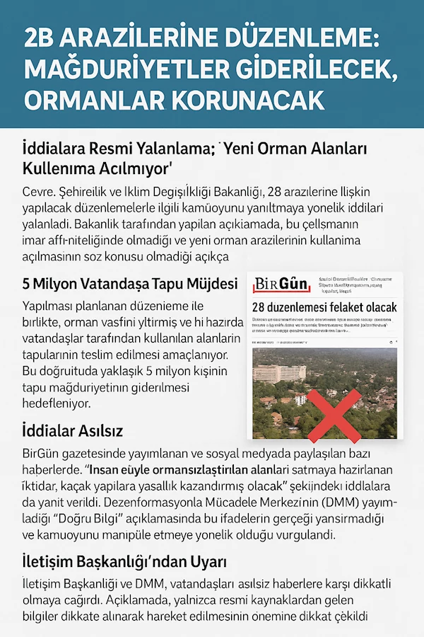 Dezenformasyonla Mücadele Merkezi (DMM), 2B arazilerine ilişkin yürütülen düzenlemeyle ilgili sosyal medya hesabı üzerinden yaptığı açıklamada, bu çalışmanın imar affı niteliği taşımadığını ve yeni orman alanlarının kullanıma açılmasının söz konusu olmadığını vurguladı.