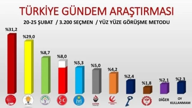 Ankete göre, CHP yüzde 31,2 ile en fazla oyu alırken, AK Parti yüzde 29 ile ikinci sırada bulunuyor. DEM Parti yüzde 8,7 ile üçüncü, MHP ise yüzde 8 oyla dördüncü sırada yer aldı.