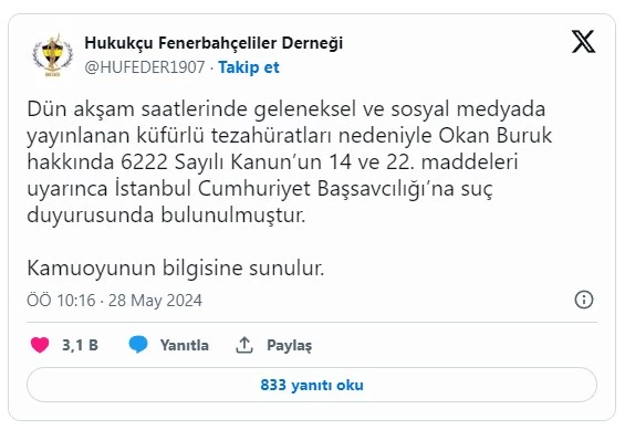 "Dün akşam saatlerinde geleneksel ve sosyal medyada yayınlanan küfürlü tezahüratları nedeniyle Okan Buruk hakkında 6222 Sayılı Kanun’un 14 ve 22. maddeleri uyarınca İstanbul Cumhuriyet Başsavcılığı’na suç duyurusunda bulunulmuştur.