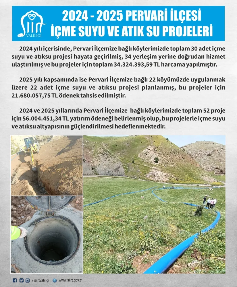 2024 yılı içerisinde Pervari ilçesine bağlı köy ve mezralarda toplam 30 adet içme suyu ve atıksu projesi tamamlanarak, 34 yerleşim yerine doğrudan hizmet ulaştırıldı. Bu projeler için toplam 34.324.393,59 TL harcama yapıldı.