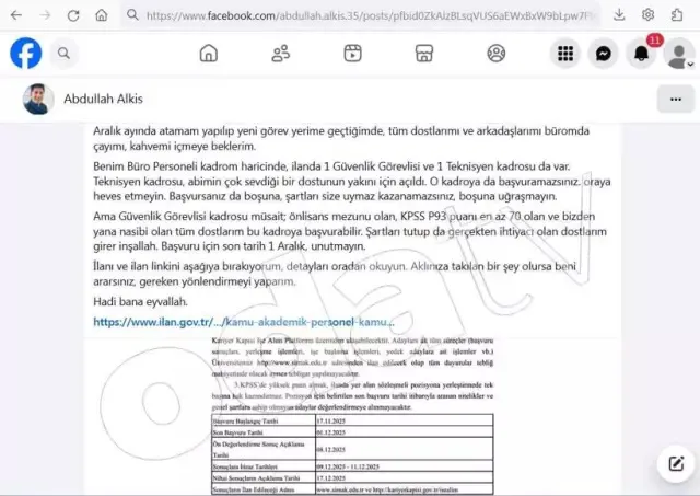 İddiaya göre Abdullah Alkış, üniversitenin açtığı sözleşmeli personel ilanının formalite olduğunu savunarak, Aralık ayı itibarıyla rektörlüğe bağlı bir birimde görevine başlayacağını belirtti. Paylaşımında kendisine özel oda, bilgisayar ve çalışma koşullarının hazırlandığını öne süren Alkış’ın ifadeleri, kısa sürede sosyal medyada gündem oldu.