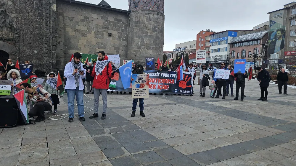 Basın açıklamasını okuyan Atatürk Üniversitesi Tıp fakültesi öğrencisi Yusuf Çiftçi, "Bizler 71 haftadır zulmün karşısında olduğumuzu kendimize ve size hatırlatmak için burada toplanıyoruz. Her cumartesi hiçbir şey yapmamaktan daha iyi olan bir şeyi yapmak için, "evimde duramadım Allahım" diyebilmek için bu meydana atıyoruz kendimizi. İsrail ateşkes antlaşması yaparak vermiş olduğu sözünü bozdu. Yalanları dosta düşmana ayan olan, şantajları ve tehditleri sosyal medyaya düşen, iftiraları çarşaf çarşaf ortaya çıkan lanetli topluluğun sözünü tutmaması, bizi şaşırtmadı. Evet, kafir kafirliğini yaptı, peki Müslümanlar Müslümanlığını yapacak mı? Kendimize sormamız gereken soru bu! Bizler ilk ateşkes fırsatında çok özlediğimiz zehir dolu boykot ürünlerine koşan haysiyetsiz kişiler mi olacağız yoksa küvözdeki bebeklerin oksijen tanklarını vurarak hastane odasında onları çürümeye bırakan bu zalime para kazandırmamayı şiar edinmiş akıl sahipleri mi olacağız?" dedi.