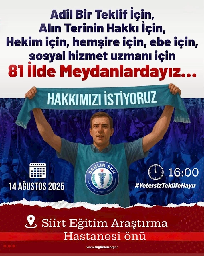 Sağlık-Sen’in 81 ilde eş zamanlı başlatacağı “Adil Bir Teklif İçin, Alın Terinin Hakkı İçin” eylemleri öncesinde, Siirt Şube Başkanı Vesim Eviz’den katılım çağrısı geldi.