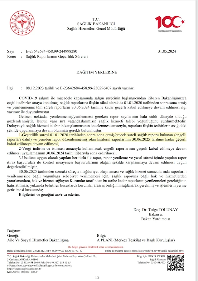 Sağlık Bakanlığı Sağlık Hizmetleri Genel Müdürlüğü Sosyal Güvenlik Uygulamaları Dairesi Başkanlığı tarafından 31.05.2024 tarihinde, geçerlilik süresi 01.01.2020 tarihinden sonra sona ermiş ve henüz yenilenmemiş süreli tüm sağlık raporlarının geçerlilik süresinin 30.06.2025 tarihine kadar uzatıldığına dair duyuru yayımlanmıştır.