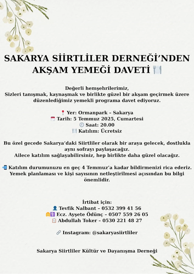 Sakarya’da ikamet eden Siirtli hemşehriler, dayanışma ve tanışma amacıyla düzenlenecek olan akşam yemeği programında bir araya geliyor. Sakarya Siirtliler Kültür ve Dayanışma Derneği tarafından organize edilen program, 5 Temmuz 2025 Cumartesi günü saat 20.00’de Ormanpark’ta gerçekleşecek.