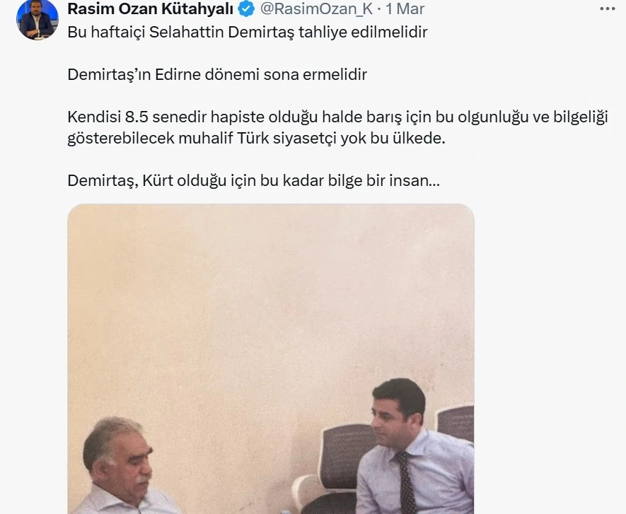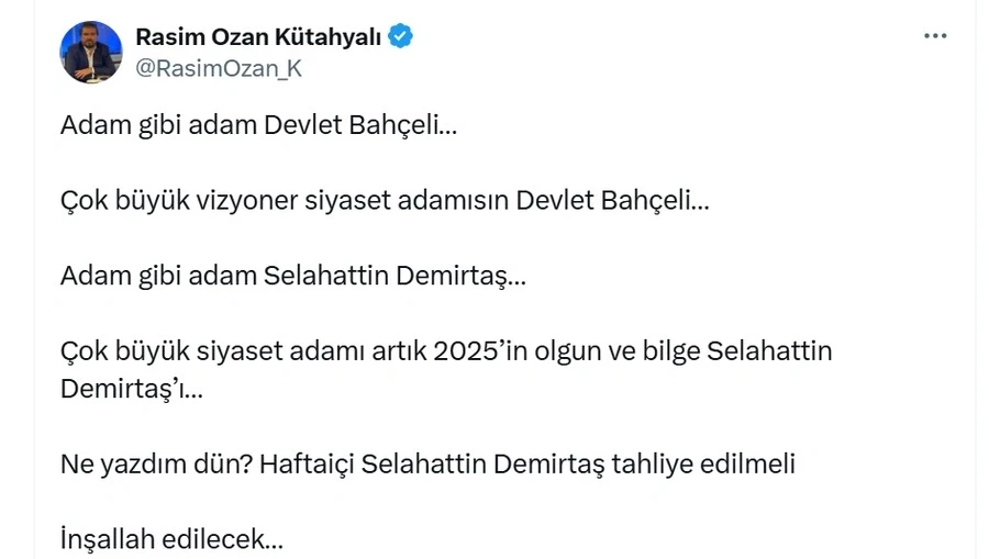MHP Genel Başkanı Devlet Bahçeli'nin, tutuklu HDP eski Genel Başkanı Selahattin Demirtaş'ı telefonla araması sonrası, gazeteci Rasim Ozan Kütahyalı dikkat çeken bir paylaşımda bulundu. Kütahyalı, Demirtaş’ın tahliye edilmesi gerektiğini belirterek, bu hafta içinde tahliye olabileceği sinyalini verdi.
